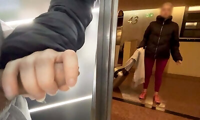 An unknown sporty gal from the hotel gives me a blowjob in the public elevator and helps me finish spunking