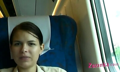 Shameless bitch Zuzinka flashes her shaved pussy in the train