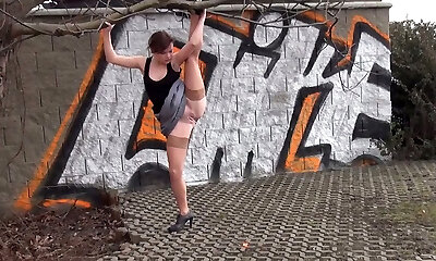 maria rya, une adolescente solo grande et flexible, joue avec un gode à l'extérieur