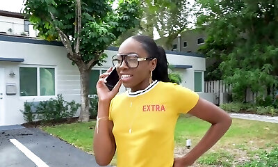 Guilty humungous breasted black head in glasses Dava Foxx has to ride powerful cock