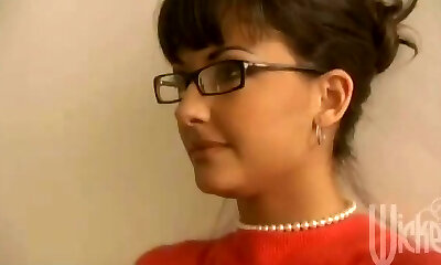 Babe with glasses Katie Thomas gets to ride a ebony rod