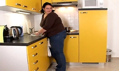 Mature milky Plumper housewife in jeans and purple blouse in the kitchen