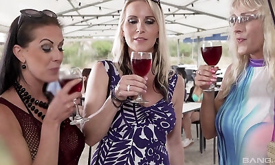 Two slutty MILFs have fun with the BBC while their bathing suits hardly cover their nipples