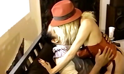 Busty platinum-blonde milf gets fucked by a long-haired dude indoors
